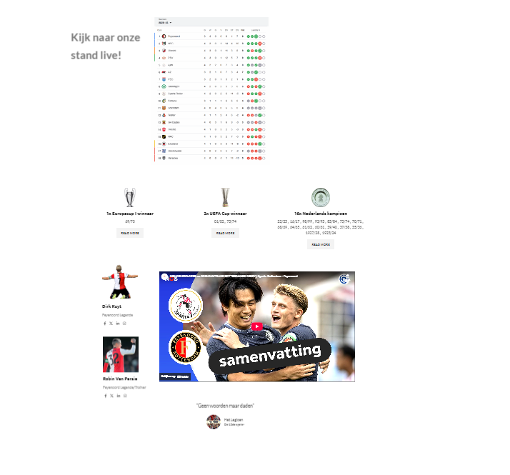 Tijdens mijn stage heb ik mijn eerste project uitgevoerd: een kleine fanwebsite over Feyenoord. Het doel van dit project was om WordPress beter te leren kennen en te oefenen met het bouwen van een website. Ik heb pagina’s gemaakt voor nieuws, wedstrijden en spelers, en geleerd hoe je een site opzet, thema’s aanpast en alles overzichtelijk beheert. Het was een zeer leerzame eerste ervaring om te ontdekken hoe websites werken en hoe je onderdelen zelfstandig kunt aanpassen binnen WordPress.